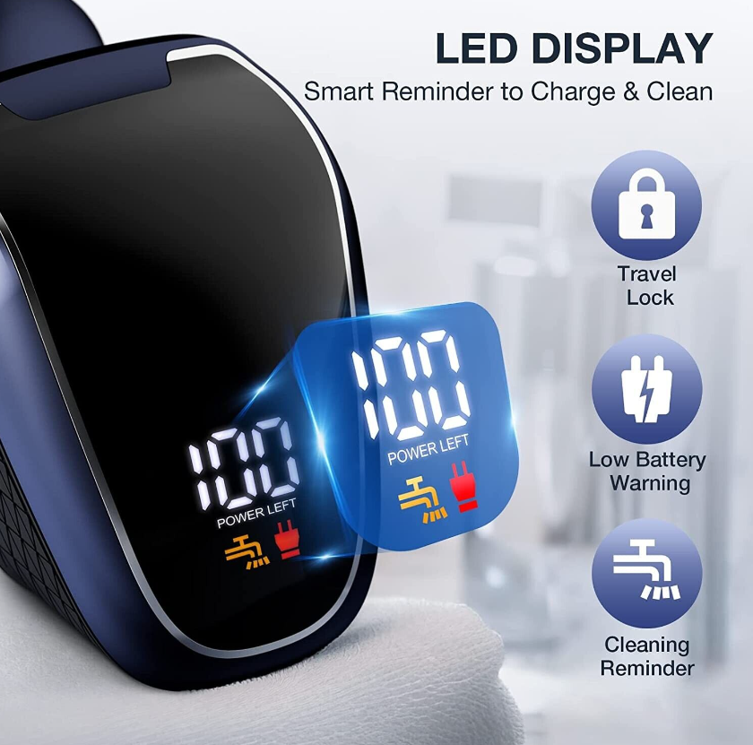 【LED Intelligent Display】The bald head shaver for men with LED display can accurately show the percentage of the battery power. Low battery reminder, water washing reminder more intelligent. Long press the switch button for 3 seconds to trigger the travel lock to avoid additional power consumption. This electric shaver uses 600mAh large-capacity battery, 1.5 hours of fast charging can provide 90 minutes of working time.