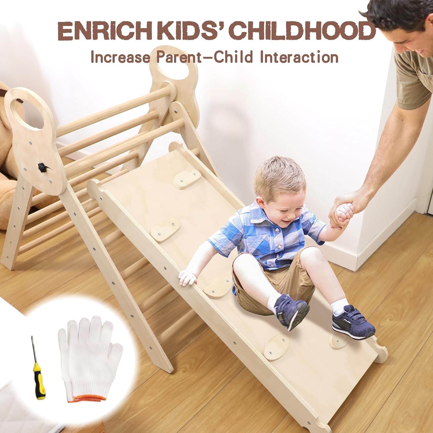 • 【7-in-1 Montessori Toddler Climbing Toys Indoor】The toddler climbing play set includes a pikler triangle, a climbing arch, and a double sided reversible thick board (climbing and slide) . Each section is a separate climbing unit, providing endless possibilities for combining them in different ways. In addition, the Triangle Ladder has multiple locking positions so you can adjust the incline as you climb or slide.