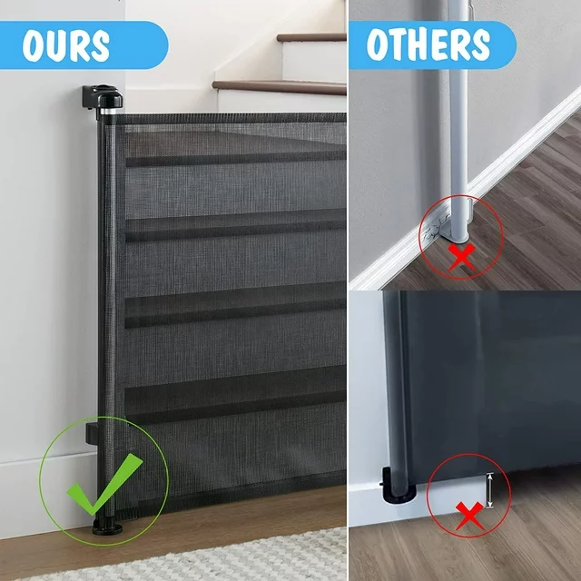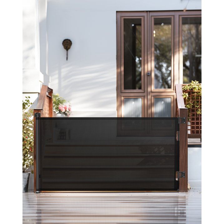 Black Retractable Mesh Baby Gate, 33" Tall, Extends to 55" Wide, This door is suitable for stairs,doorway and bedroom. A versatile safety solution for your home. Designed to protect children and keep pets in check, this gate is perfect for stairs, doorways, and hallways. With a sleek mesh design, it offers both visibility and security. It's adjustable, extending up to 55 inches wide, making it ideal for larger spaces. Easy to use and store, simply pull it across when needed and retract it when not in use. Installation is a breeze. Choose safety and elegance with Retractable Baby Gates.